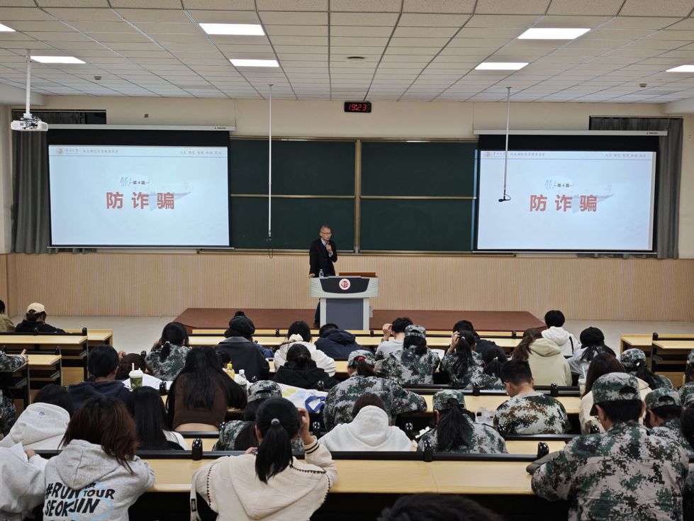 讲座中,邹峰老师以“全方位守护校园安全”为核心,从网络安全、消防安全、人身安全、财产安全四个维度进行详细讲解。他结合自身工作经验及现实案例,系统剖析了电信网络诈骗、校园贷、虚假兼职等诈骗类型的作案手法,重点突出了消防安全、财产安全等方面的易发事件,并传授相应防范技巧。他强调,校园安全无小事,掌握安全技能对促进个人成长和维护校园稳定具有重要意义,希望全体新生将各类安全知识牢记于心,时刻保持警惕,养成良好的安全习惯。