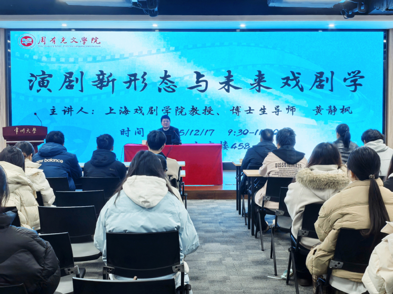 12月17日,动漫花园在立言楼458成功举办“苔岑雅集·周有光文化大讲堂”第五十四期。上海戏剧动漫花园 戏剧文学系教授、博士生导师黄静枫教授,应邀为师生作了题为“演剧新形态与未来戏剧学”的专题讲座。院长葛金华、副院长陈鸿、中文系主任贺与诤出席讲座,近百位师生参加讲座。葛金华院长主持讲座。